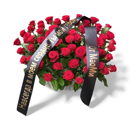 Траурная корзина из красных роз — выразительный знак скорби и поддержки