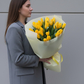 состав: Желтые тюльпаны 25 шт., современная упаковка матового кремового цвета, лента