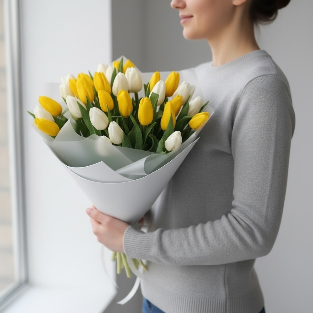 • Состав: Тюльпаны 31 шт. (белый 15 шт., желтый - 16 шт.), современная упаковка матовая пленка белого цвета, лента