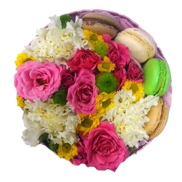 Коробка «Комплимент» — это симбиоз цветочной красоты и гастрономического удовольствия. Нежные цветы сочетаются с аппетитными макарунами, создавая уникальную композицию. Такой подарок выражает тёплые чувства и заботу, подходит для поздравления коллег, друзей или любимых. Превратите обычный день в праздник с помощью этого очаровательного набора!