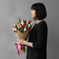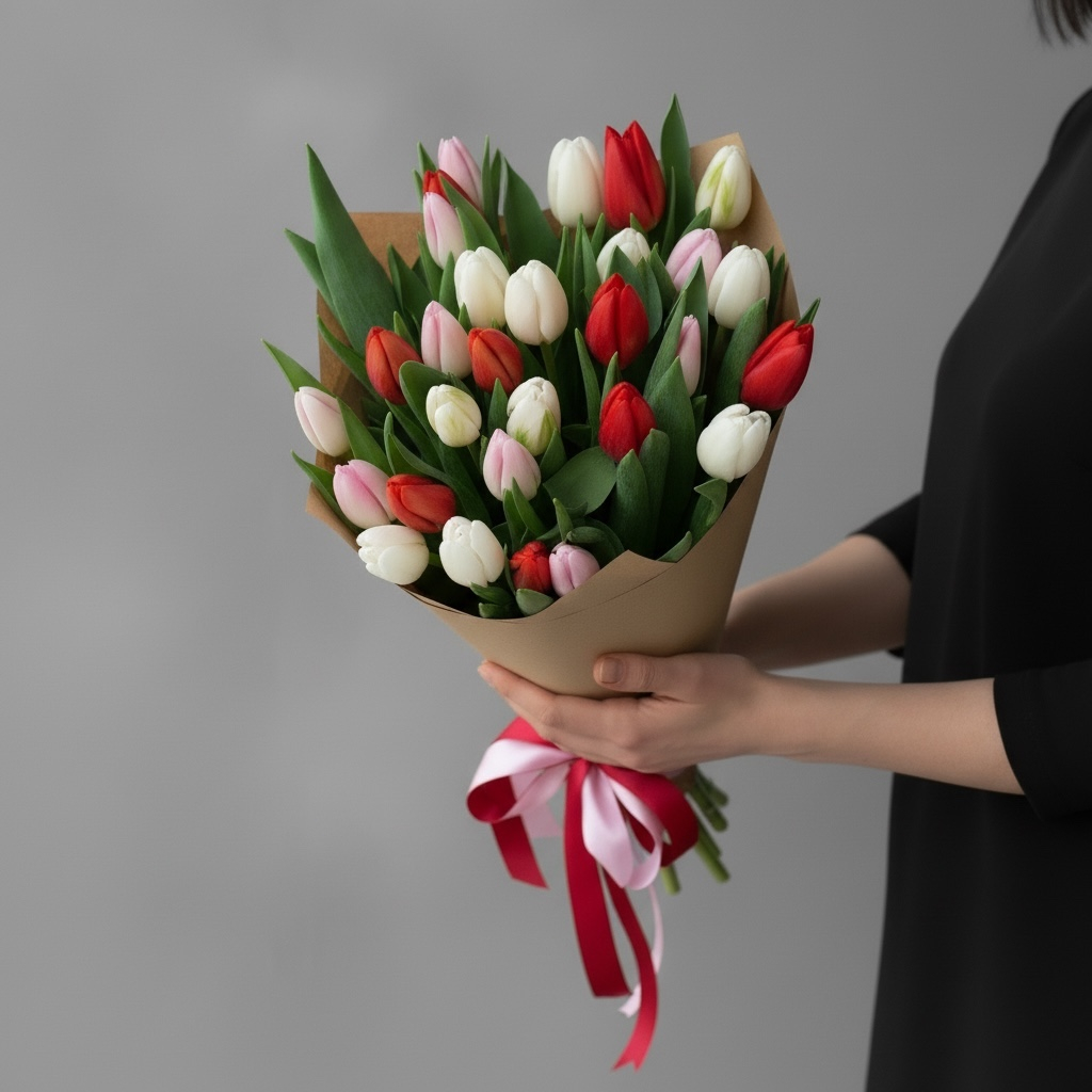 Состав: тюльпаны (белый, розовый, красный) - 31 шт. современная упаковка однотонный крафт, атласные ленты