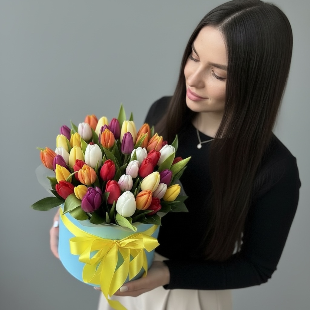 Букет тюльпанов в шляпной коробке — изысканный праздничный подарок к 8 Марта. Нежные бутоны аккуратно уложены в элегантную коробку, которая не только подчёркивает красоту цветов, но и избавляет от необходимости искать вазу. Свежесть тюльпанов гарантирована: мы тщательно отбираем каждый цветок, следя за плотностью бутонов и упругостью стеблей. Разнообразие оттенков создаёт радостное весеннее настроение — такая композиция станет тёплым знаком внимания для мамы, жены, сестры или коллеги. Компактный формат позволяет легко транспортировать букет, а продуманное оформление делает его готовым решением для поздравления. Подарите близким частичку весны — выберите букет в шляпной коробке!