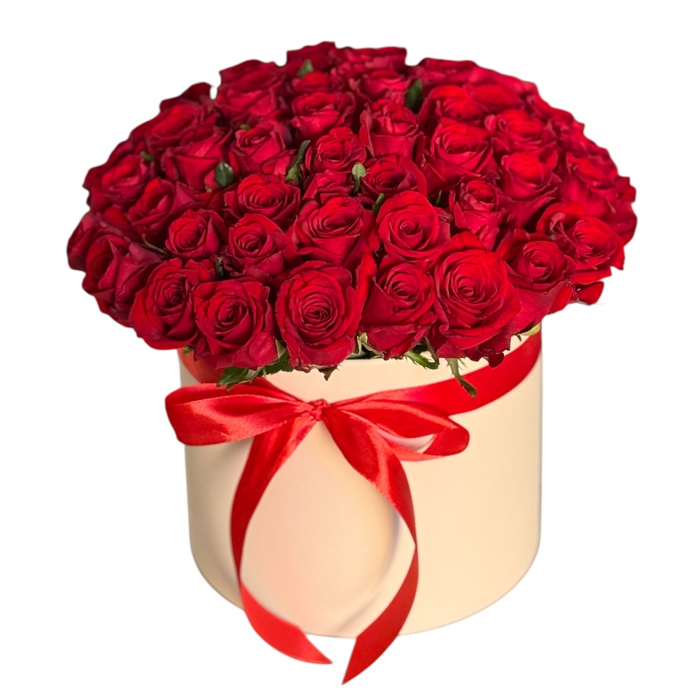 • состав: Роза (красный) 51 шт., Пиафлор 1 шт., Шляпная коробка