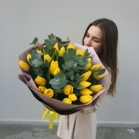 состав: тюльпан желтый 39 шт., эвкалипт 7 шт., бумага крафт