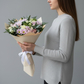 Состав букета: Роза белая 3 шт., Роза кустовая белая 3 шт., Орхидея 3 шт., Хризантема 3 шт., Альстромерия 3 шт., Эвкалипт, папоротник Упаковка, лента