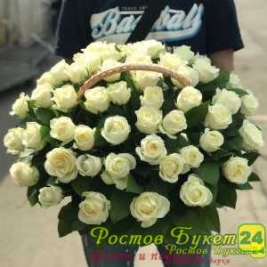 Состав корзины: Белые розы, 51 шт. Флористическая губка Корзина плетеная Размер: Высота, 50 см. Ширина, 65 см.