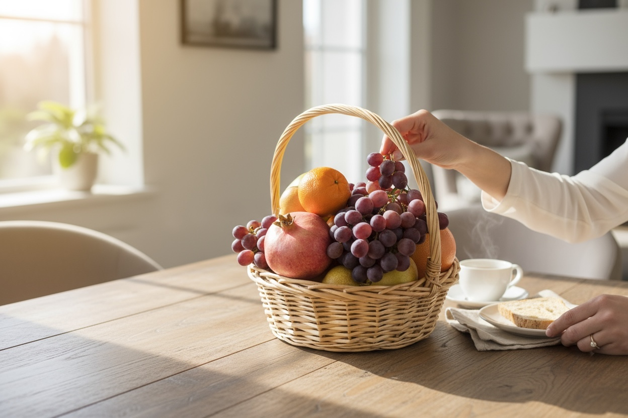 Эстетика подачи: стильная корзина и аккуратная укладка превращают фрукты в настоящий подарочный шедевр.