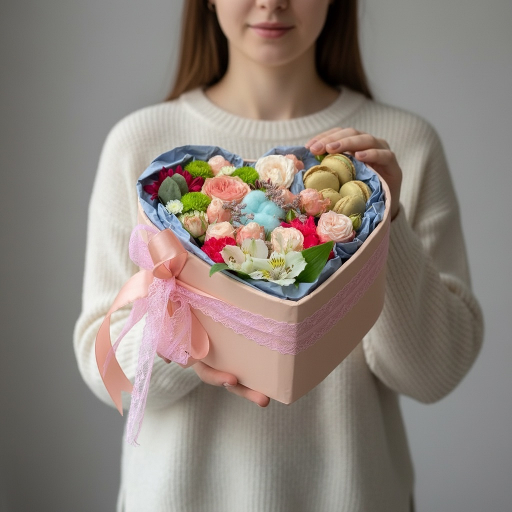 Состав: Дизайнерская коробка сердце, Микс цветов (розы, альстромерия, хризантема, эвкалипт, пионовидные розы, хлопок) Макарон - 5 шт., Лента