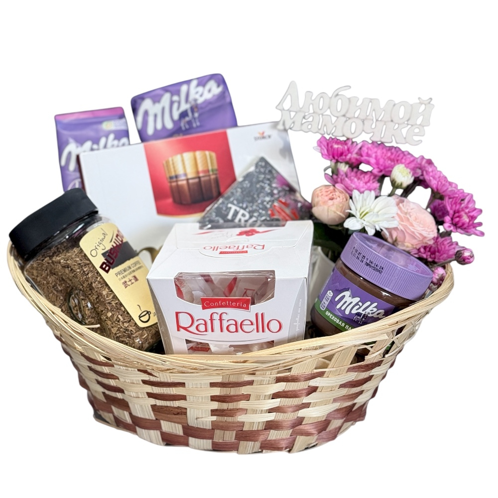 Состав: Шоколадные конфеты Merci (Мерси), Конфеты Raffaello, Паста Milka ореховая с добавлением какао, плитка молочного шоколад TRUFFLES, Шоколад Milka (Милка), Кофе растворимый Bushido Original, топпер Любимой маме, цветочная композиция из роз и хризанте