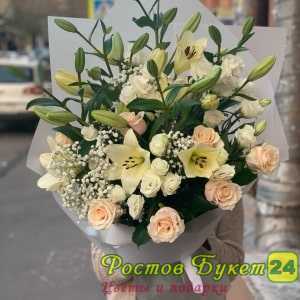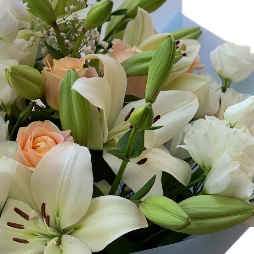 Букет «Нежная» — это воплощение утонченной элегантности и природной грации. Изящное сочетание белоснежных лилий, кремовых роз и нежных эустомы создает неповторимую атмосферу романтики и умиротворения.