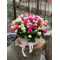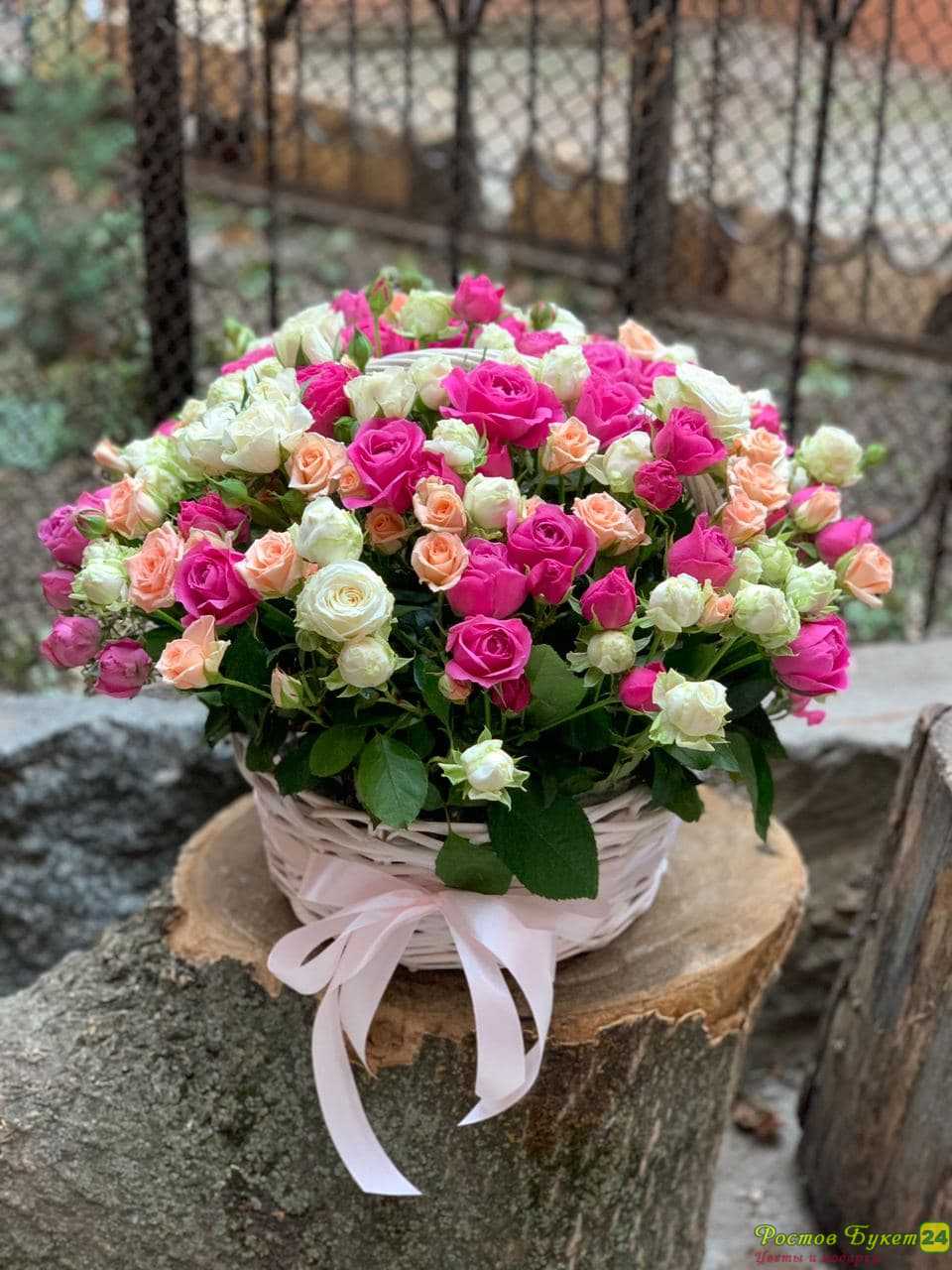 Состав: Роза кустовая (белый) — 10 шт., Роза кустовая (кремовый) — 10 шт., Роза кустовая Бомбастик (нежно-розовый) — 15 шт., Пиафлор / оазис/ флор. губка — 2 шт., Корзина (круг, малый) — 1 шт.