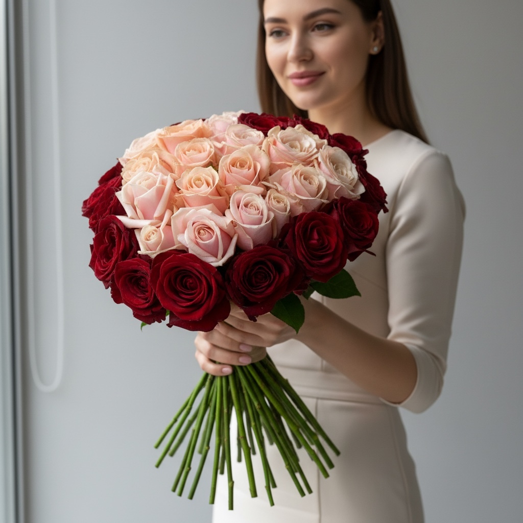 Романтический букет в форме сердца из 35 роз — искренний способ сказать «я люблю» без слов. Каждая роза тщательно подобрана: пышные бутоны насыщенного оттенка, упругие стебли и свежие листья создают выразительный, целостный образ. Компактная форма сердца делает композицию особенно символичной — она словно передаёт биение влюблённого сердца. Нежное оформление подчёркивает романтическую суть подарка, не отвлекая внимания от красоты цветов. Такой букет станет незабываемым признанием в чувствах, идеальным сюрпризом на День святого Валентина, годовщину или день рождения любимой.