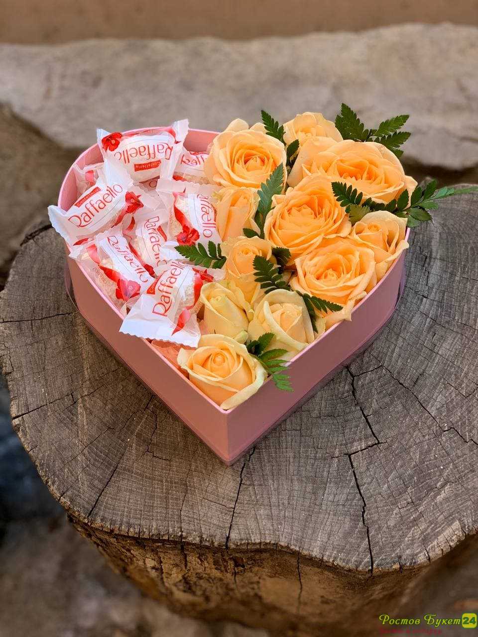 Изысканная композиция «Сердце» — это гармоничное сочетание романтики и утончённого вкуса. Одиннадцать нежных роз, аккуратно уложенных в форме сердца, создают трогательный образ, полный тепла и искренних чувств. Дополняют букет элегантные конфеты Raffaello, придающие подарку особую изюминку и превращающие его в полноценный сюрприз. Такая композиция станет незабываемым признанием в любви, прекрасным поздравлением с юбилеем или трогательным знаком внимания для дорогого человека. Свежий аромат роз и сладкий акцент конфет создают неповторимую атмосферу праздника и заботы.