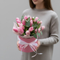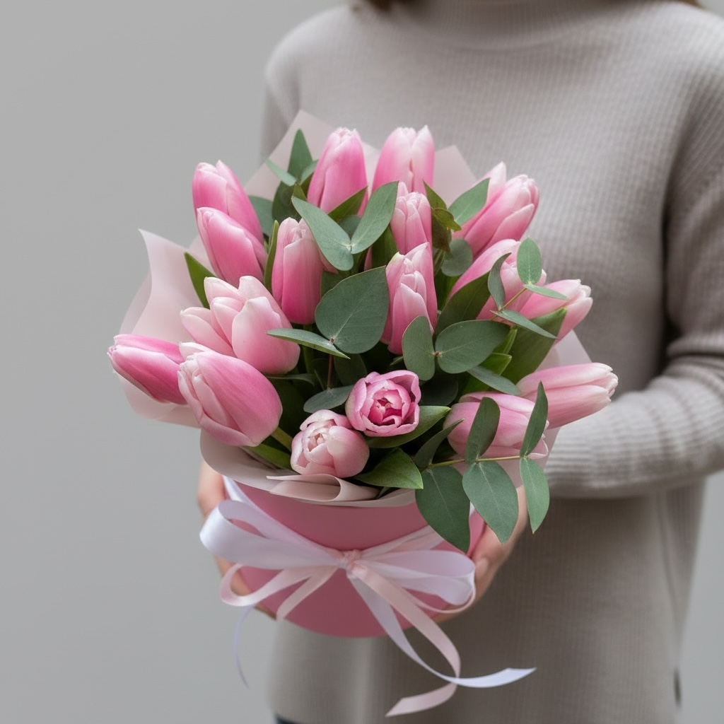 Розовый тюльпан в коробке — утончённый подарок, где каждая деталь продумана до мелочей. Нежный оттенок бутонов создаёт атмосферу тепла и искренности, а компактная коробка придаёт композиции законченный, элегантный вид. Такой формат избавляет от необходимости искать вазу: букет сразу готов к вручению и органично вписывается в любой интерьер. Свежие тюльпаны тщательно отбираются — их упругие стебли и аккуратно раскрывающиеся бутоны гарантируют долгую свежесть. Этот подарок подойдёт для выражения симпатии, поздравления с особым событием или просто как знак внимания: он говорит без слов о заботе и хорошем вкусе дарителя.