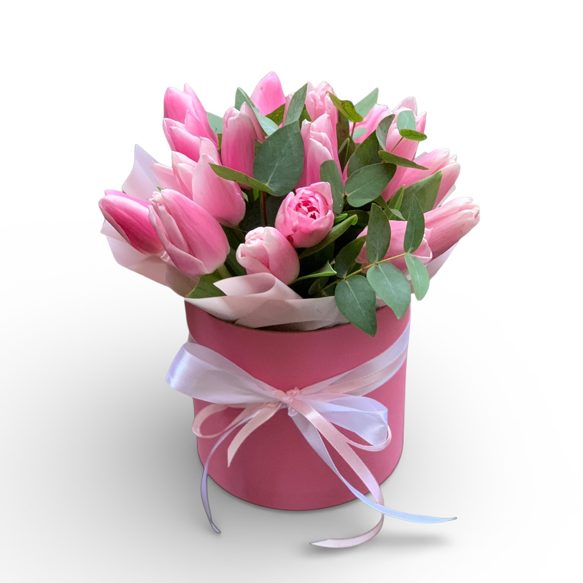 Состав: Тюльпан розовый - 19 шт., Коробка розовая средняя, Ленты, Аквапак