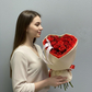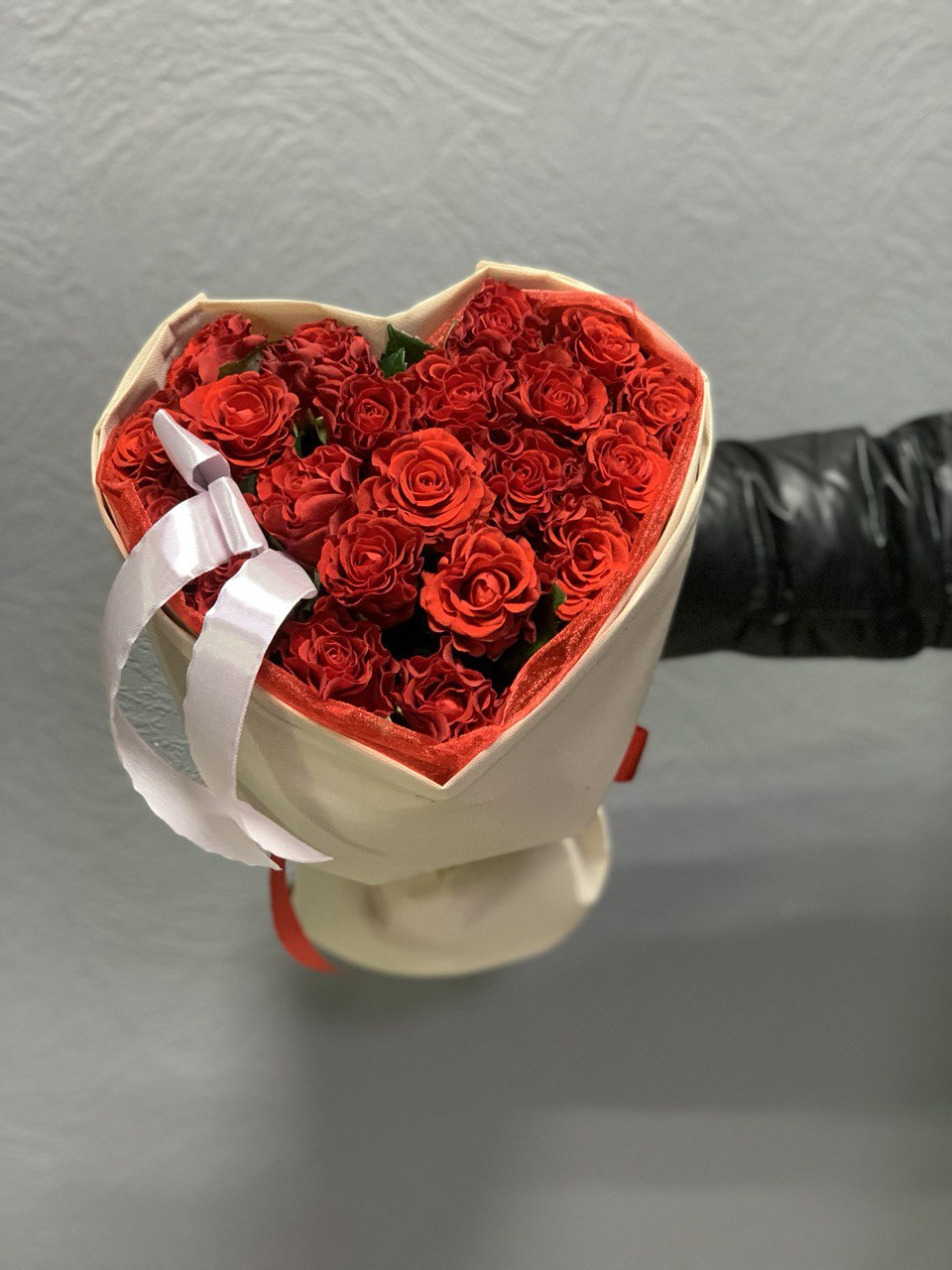 Состав: роза красная 21 шт., матовая пленка, тишью, атласная лента, каркас форма сердца