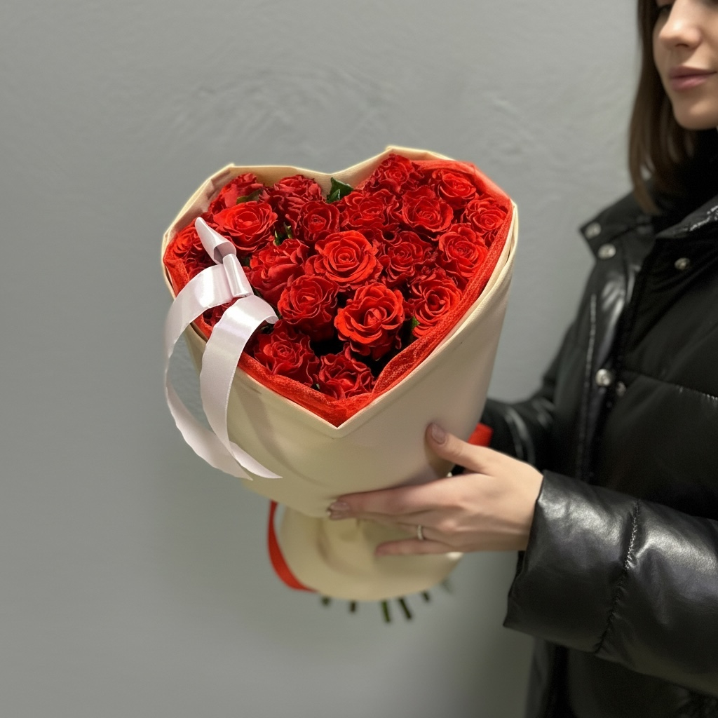 Изящная композиция в форме сердца из благородных роз — это воплощение искренних чувств и утончённого вкуса. Каждая роза тщательно отобрана: свежие бутоны с насыщенными, глубокими оттенками создают завораживающую игру цвета и фактуры. Аккуратная форма сердца подчёркивает романтическую суть подарка, превращая его в настоящее признание без слов. Такая композиция станет идеальным жестом для дня рождения, годовщины или просто как тёплый знак внимания тому, кто дорог. Элегантное оформление делает букет готовым сюрпризом — достаточно лишь передать его в руки тому, кому адресовано ваше тепло и забота.