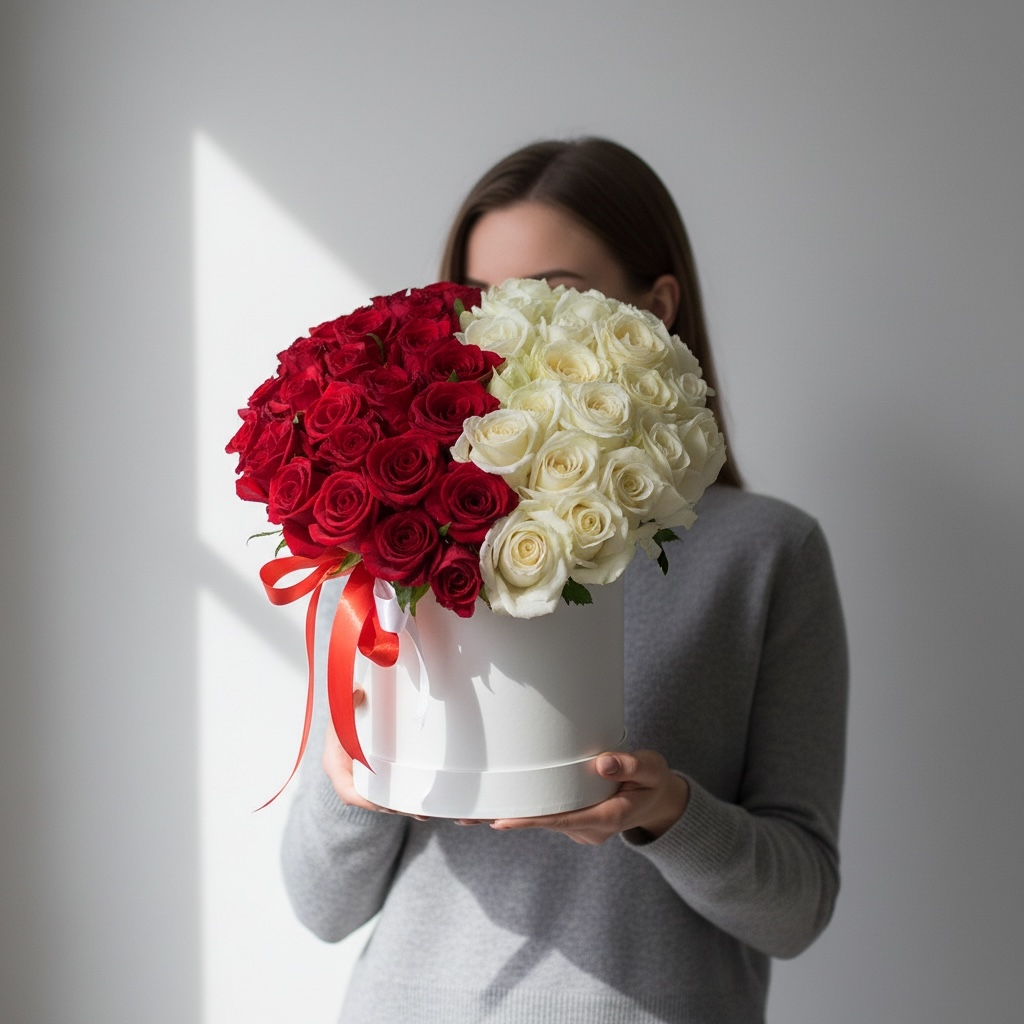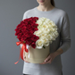 состав: 26 красных и 23 белых роз, шляпная коробка, оазис, ленты