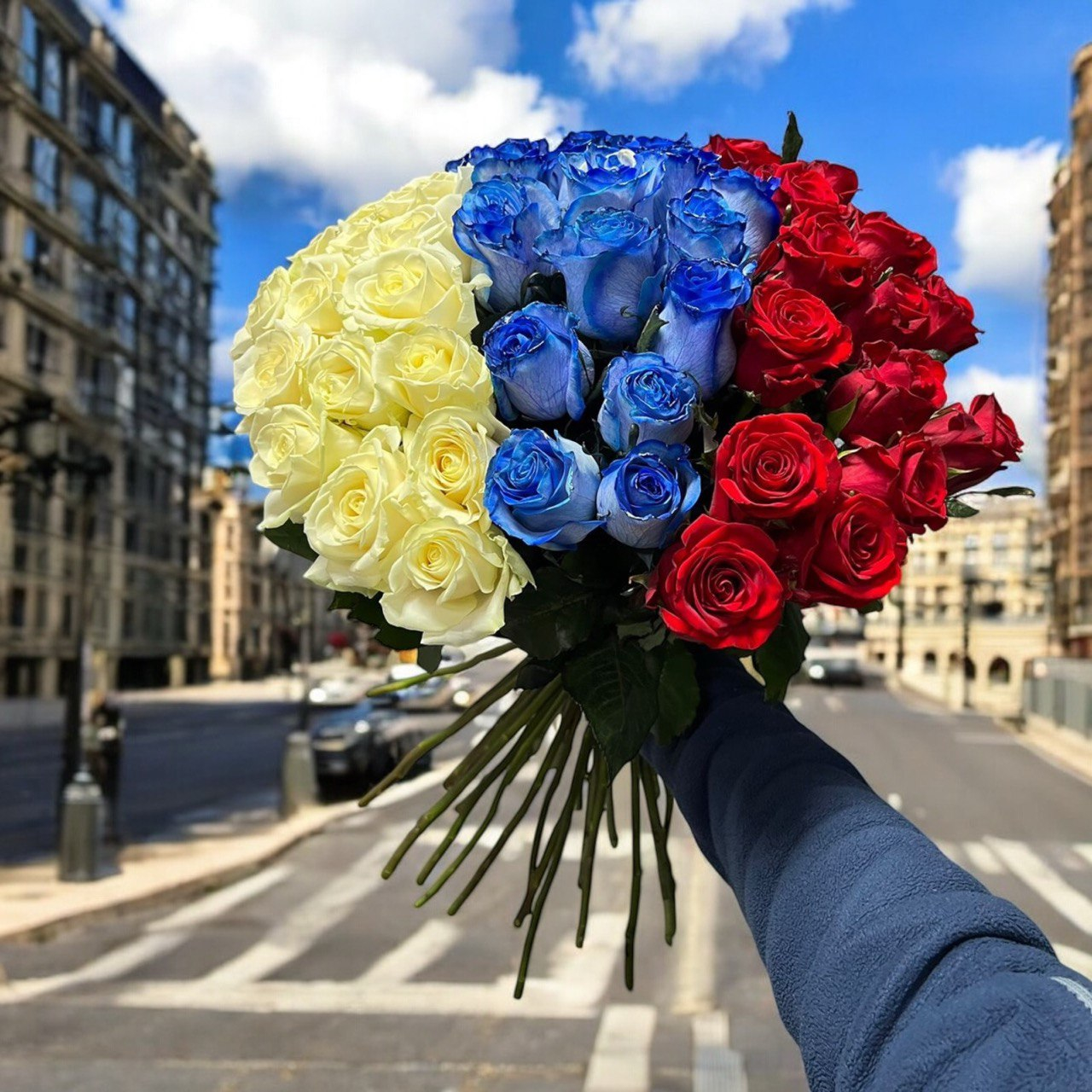 Отбор цветов: только розы с плотными бутонами и насыщенными оттенками, соответствующими цветам флага.