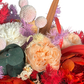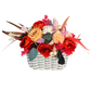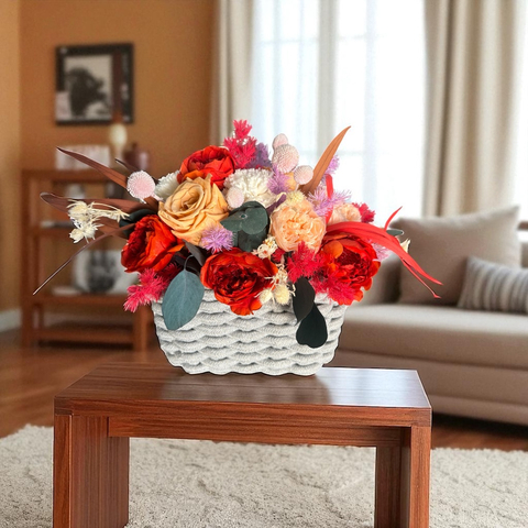 Основой композиции "Осенние оттенки" являются стабилизированные цветы, такие как пионовидная роза 'OHara', которая украшает композицию своими насыщенно-красными оттенками. В дополнение к росам, в составе присутствуют эвкалипт стабилизированный, лагурус, кермек, тиласпия, аспарагус и гипсофила. Эти элементы придают букету уникальный колорит, который легко можно адаптировать под индивидуальные предпочтения заказчика. Благодаря гибкости в подборе элементов, каждый букет становится уникальным произведением искусства, отражающим личные интересы получателя.