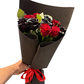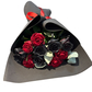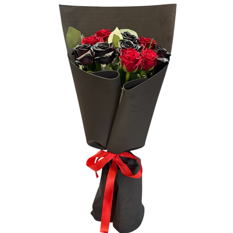 состав: роза красная 5 шт., роза чёрная 5 шт., фоамиран чёрный, эвкалипт, атласная лента