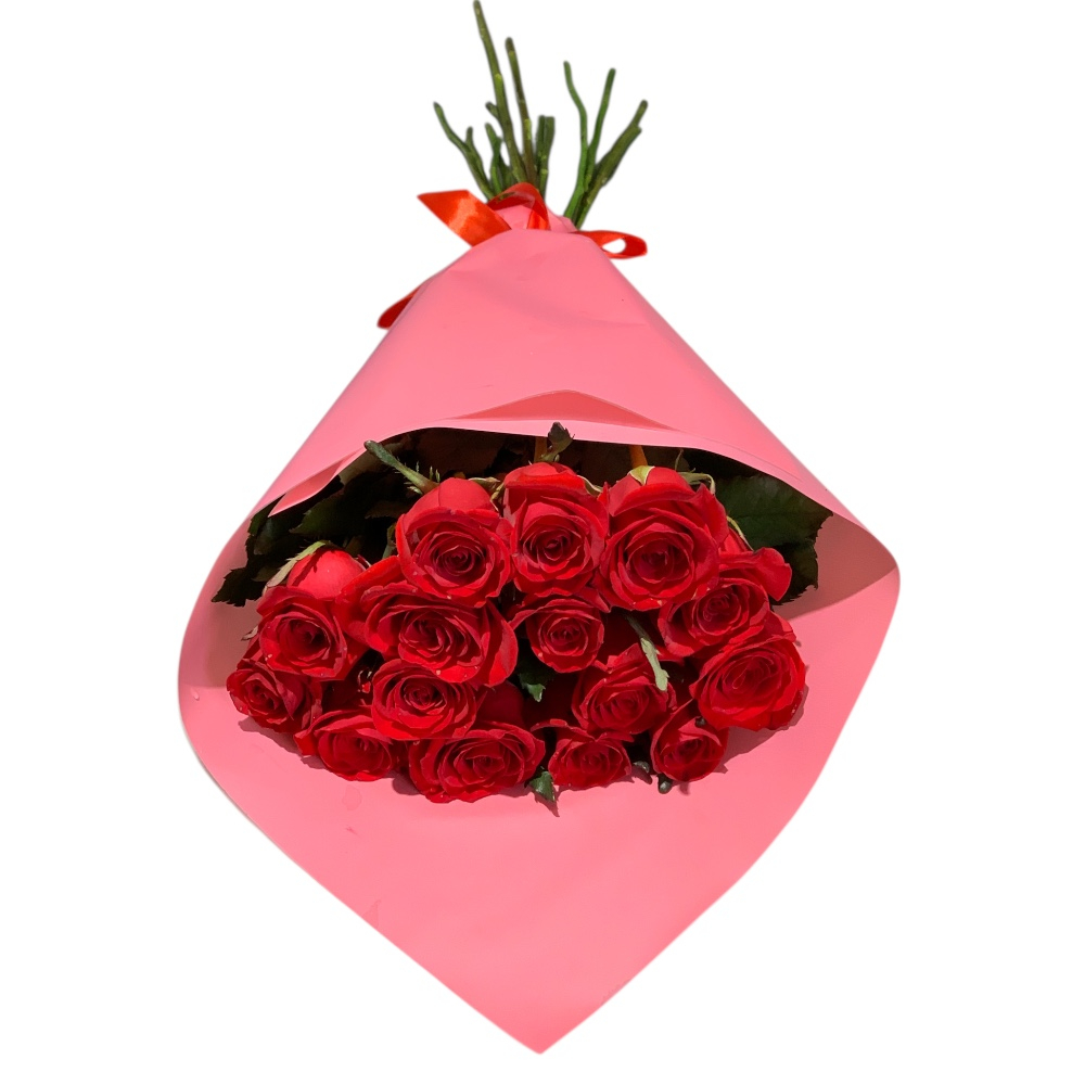 Состав: Роза Россия (ярко-красная, 70 см) — 15 шт., Упаковка Розовая матовая пленка — 1 шт., Лента атласная — 1 шт.,