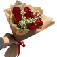 Состав: Роза красная 50см - 7, Гипсофила - 1, Упаковка (пленка матовая) тишью золотисто коричневая , матовая полупрозрачная пыльно коричневая - 1, Лента красная атласная под цвет роз - 1. шт.