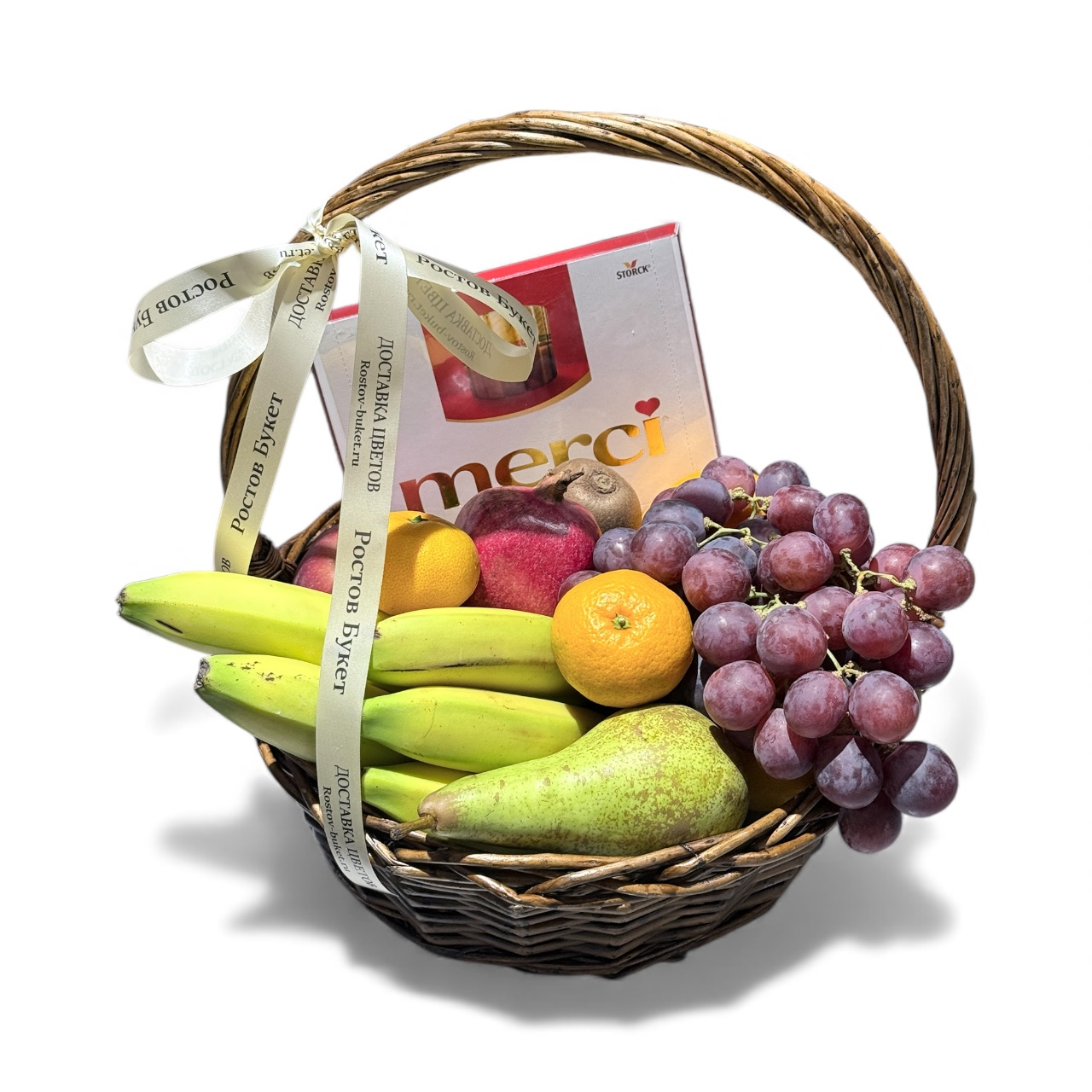 Состав: Бананы - 5 шт., Виноград (600 гр.), Гранат - 1 шт., Мандарины - 4 шт., Киви - 2 шт., Яблоки - 5 шт., Апельсин - 1 шт., Груши - 2 шт., Шоколадные конфеты Merci 250 гр., Корзина средняя