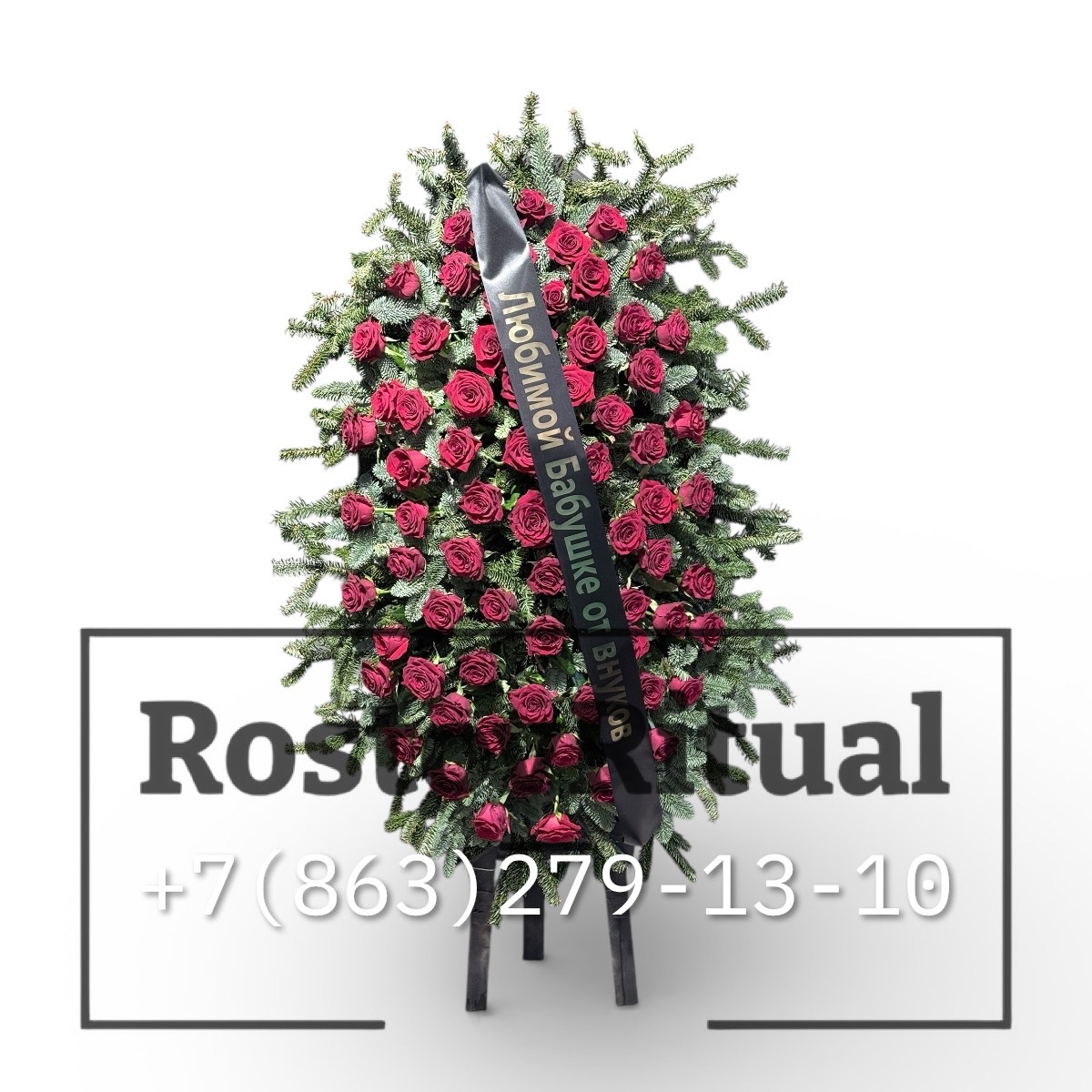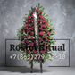 Красные розы — вкраплены в хвойную основу, создавая контрастные акценты. Алый оттенок цветов олицетворяет силу чувств, любовь и уважение к ушедшему. Розы добавляют композиции деликатную эмоциональную глубину, не нарушая траурного настроя.