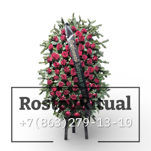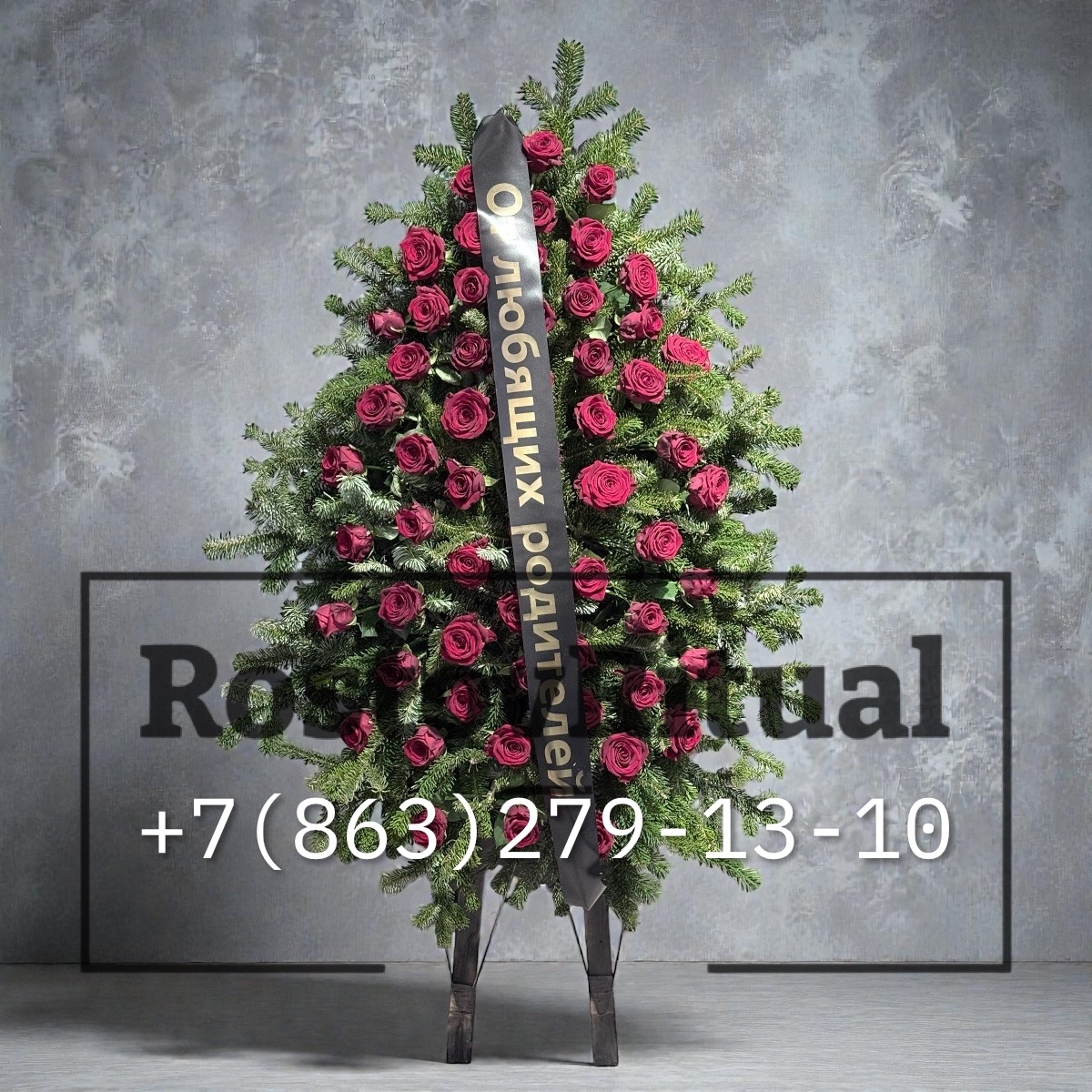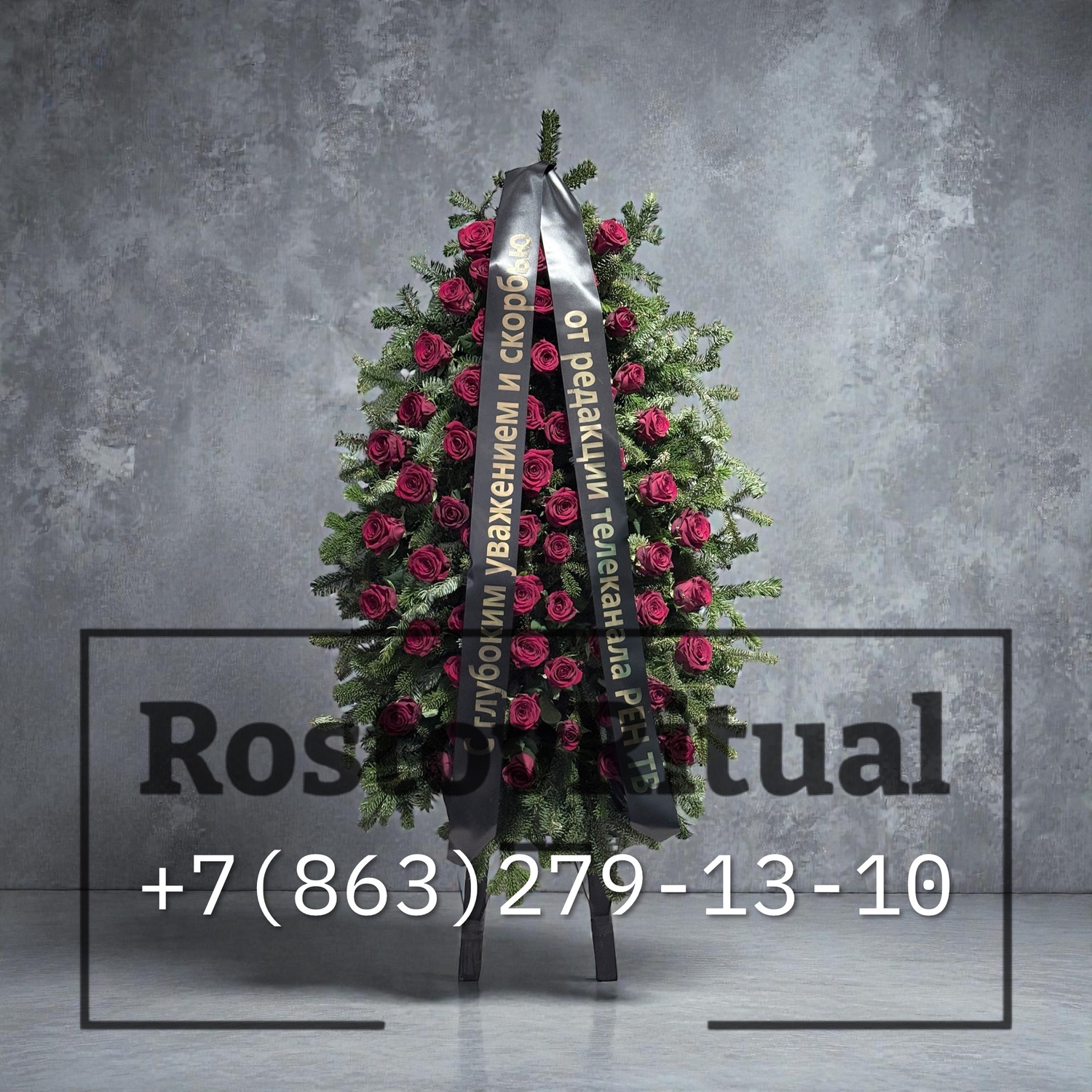 Этот траурный венок — сдержанное и проникновенное выражение скорби и вечной памяти. Композиция гармонично объединяет природную стойкость хвойных растений и глубокую символику красных роз.