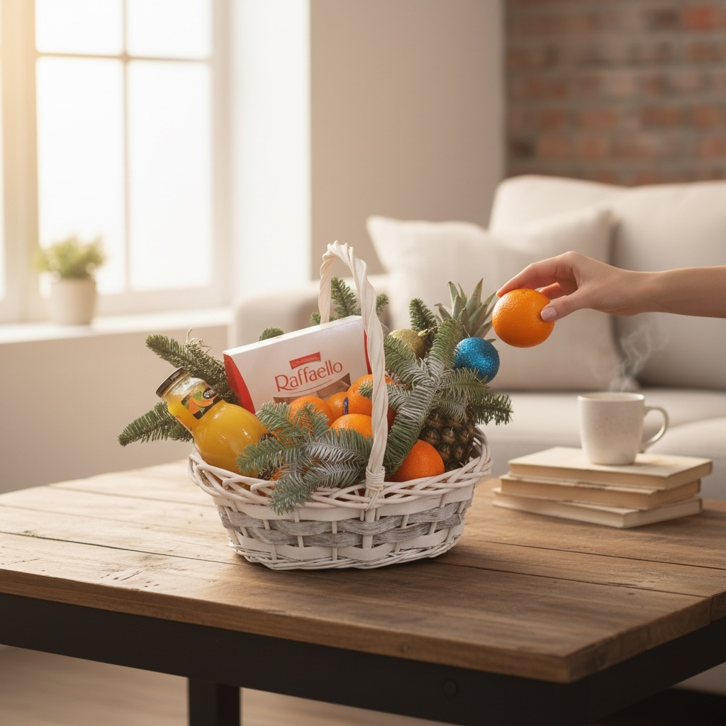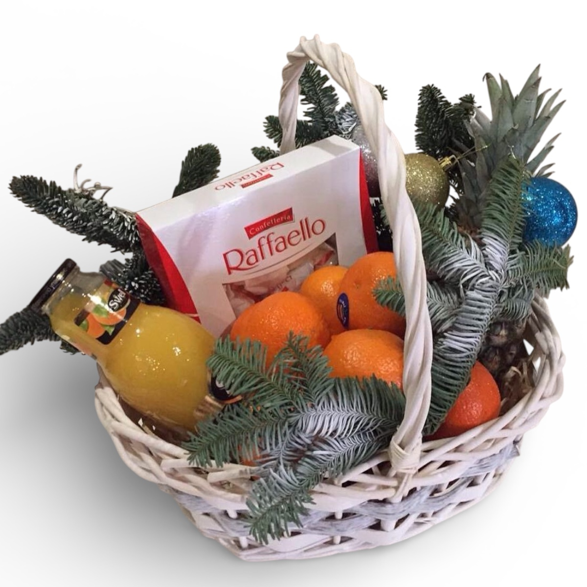 Ищете оригинальный и вкусный подарок к Новому году? Представляем нашу праздничную фруктовую корзину, которая сочетает в себе свежесть фруктов, изысканность конфет Raffaello и праздничное оформление!