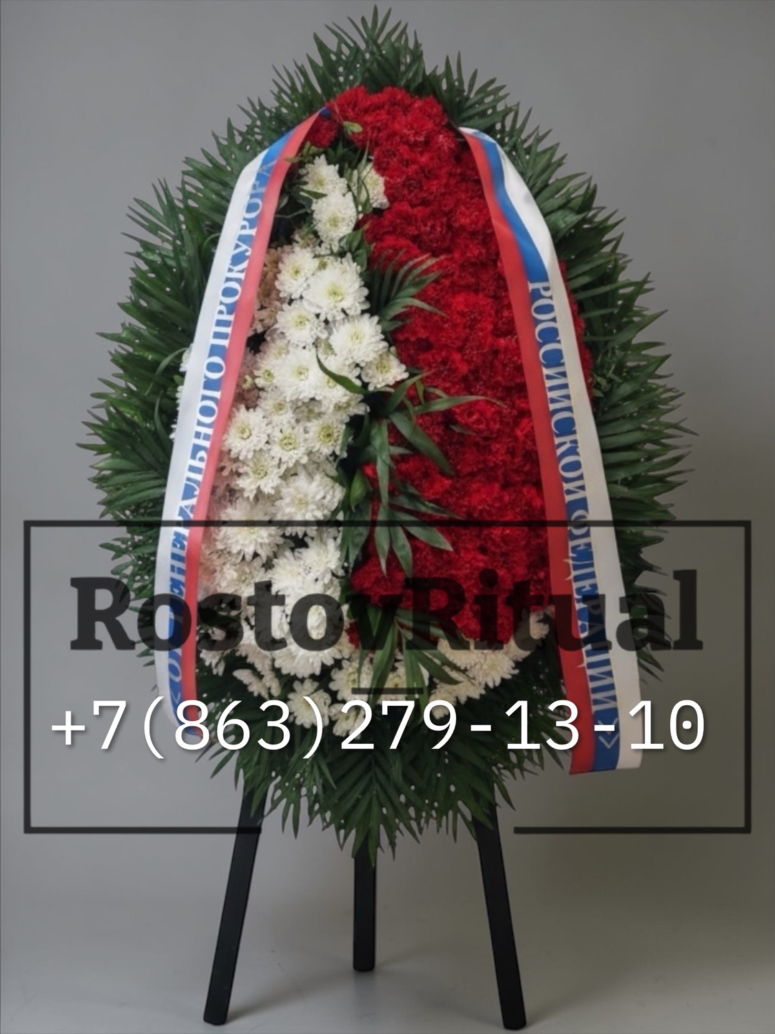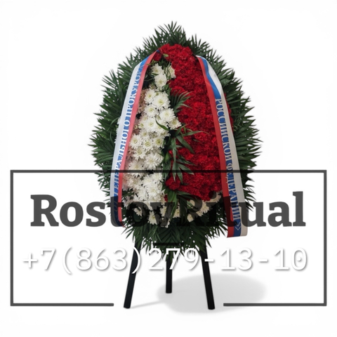 Сочетание природной красоты живых цветов и символики государственного флага делает этот венок выразительным знаком уважения и скорби.