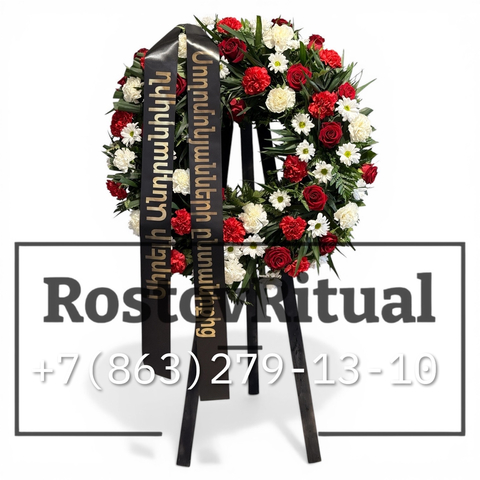Траурный венок — трогательный способ выразить скорбь и почтить память ушедшего. Композиция выполнена из свежих цветов: ярких красных роз и гвоздик, нежных белых хризантем, дополнена сочной зеленью. Круглая форма венка символизирует вечность и бесконечность памяти.