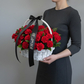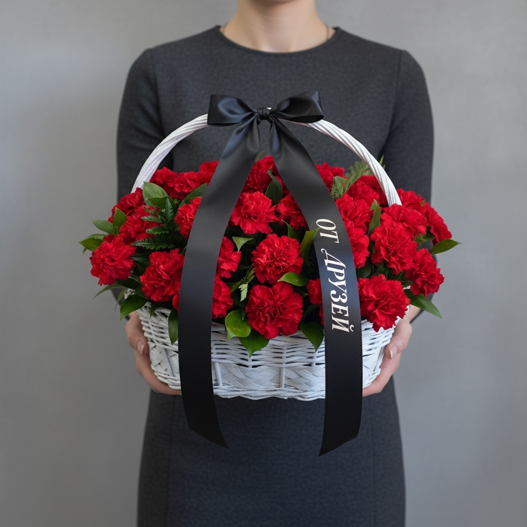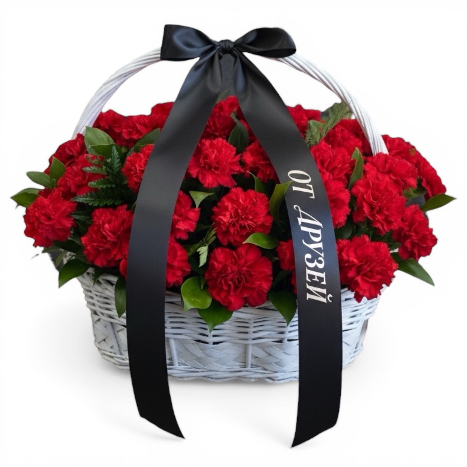 Выразите скорбь и уважение с элегантной траурной корзиной из свежих красных гвоздик. Пышная композиция в стильной плетёной корзине украшена чёрной лентой с надписью «От друзей», что придаёт букету особую торжественность и душевность. Красные гвоздики символизируют искреннюю память, преданность и тёплые чувства к ушедшему.