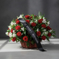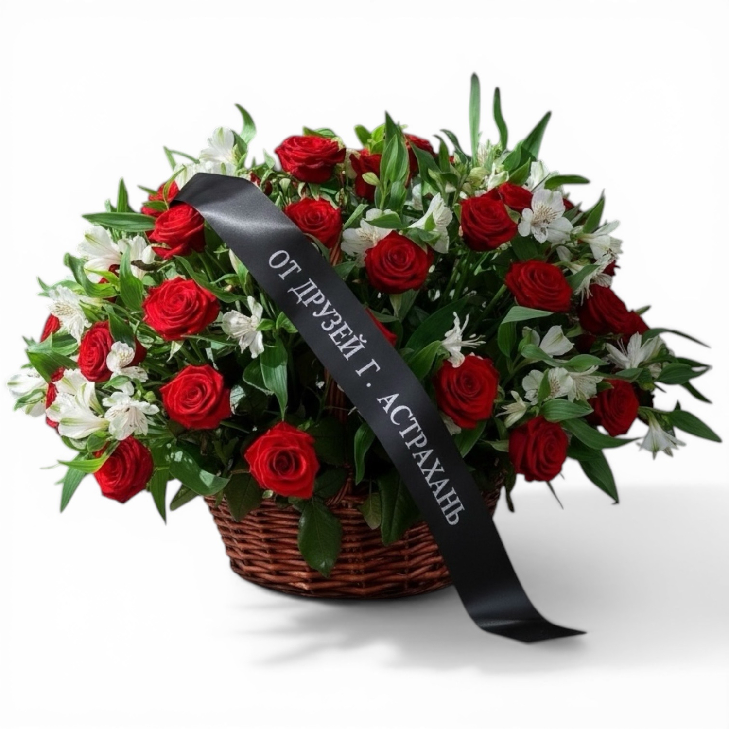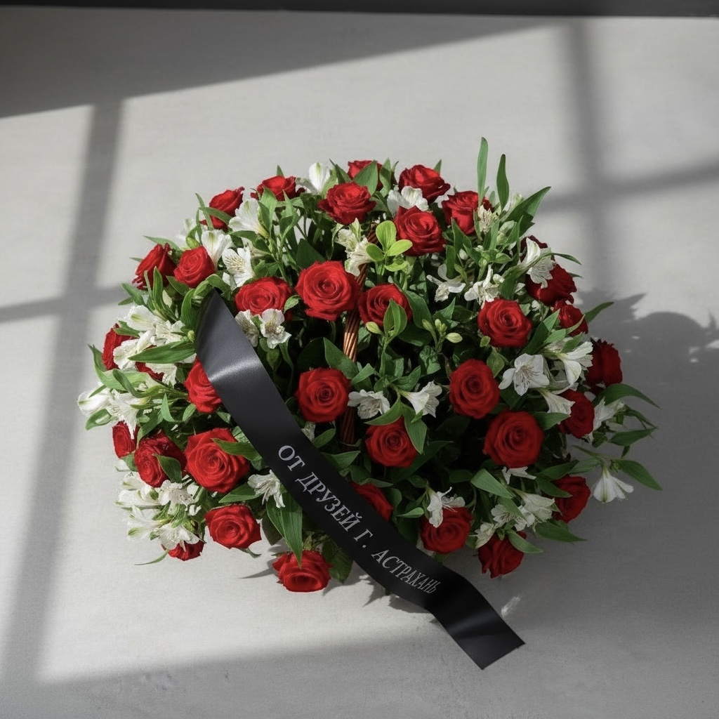 Траурная корзина с красными розами и белыми альстромериями — трогательный способ выразить скорбь и уважение. Пышная композиция в плетёной корзине украшена чёрной лентой с надписью «От друзей г. Астрахань», что придаёт букету особую торжественность. Красные розы символизируют любовь, память и вечную преданность, а белые цветы — чистоту души и светлую грусть. Зелёная листва гармонично дополняет композицию, делая её элегантной и сдержанной. Корзина подойдёт для возложения на могилу, мемориал или передачи родным в знак поддержки в трудную минуту.