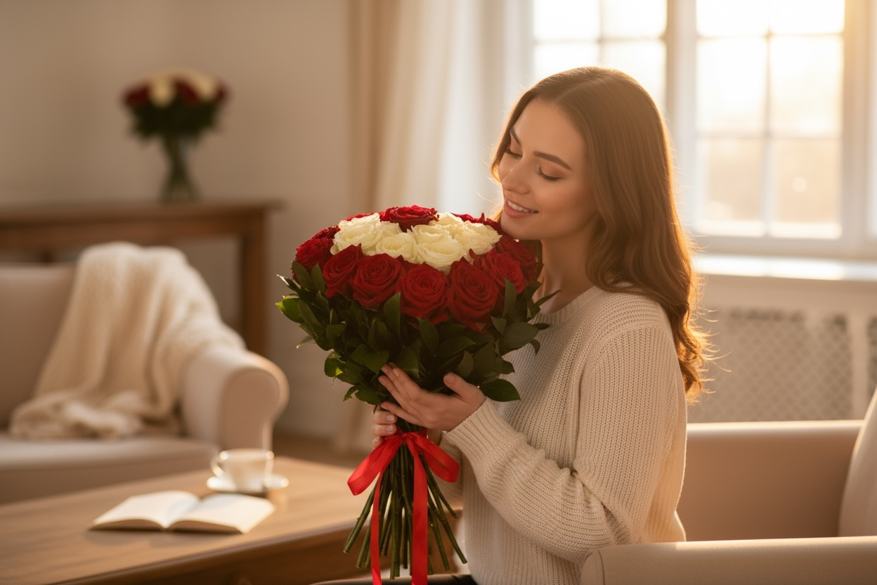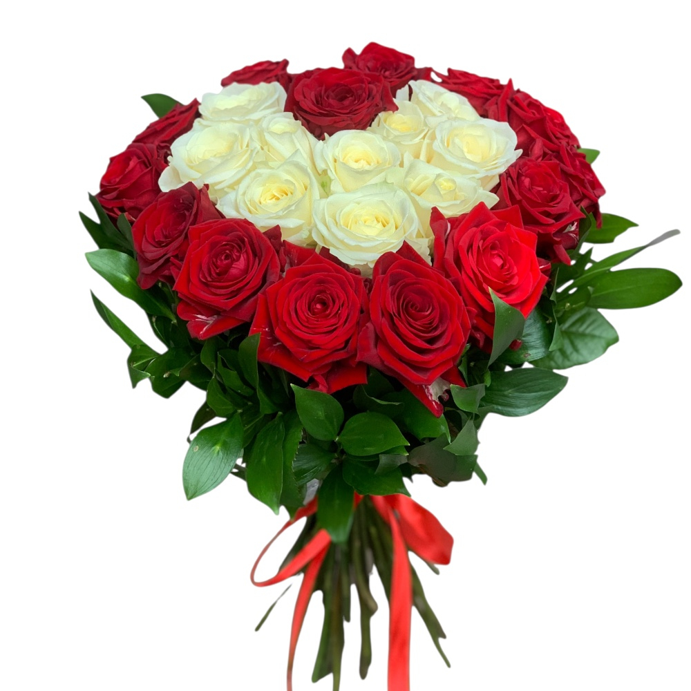 Состав: Розы красные 15 шт., Розы белые 10 шт., Атласная лента