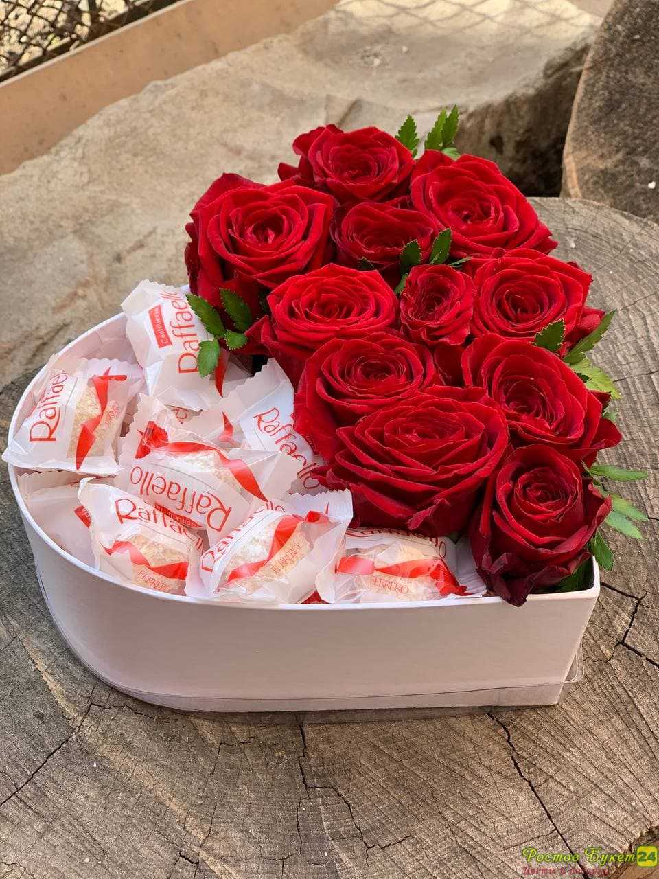 • Состав: Красная роза 11 шт., Рафаэлло - 150 гр., Коробка сердце, Оазис