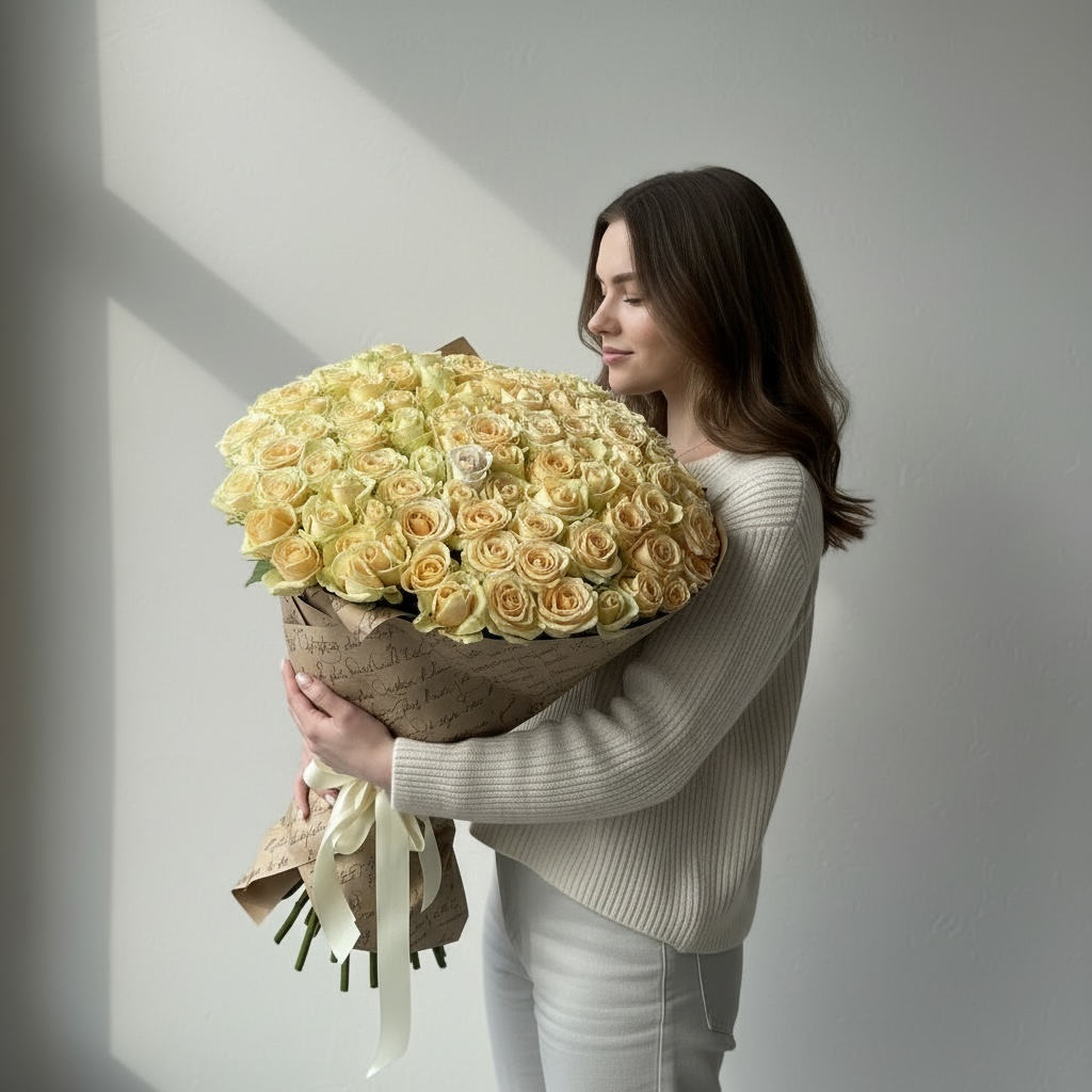 Состав: роза- 101шт, современная упаковка крафт, лента