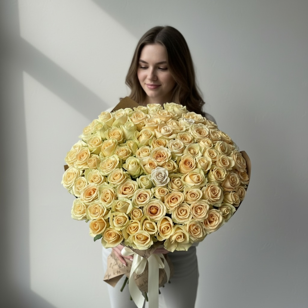 Букет «101 персиковая роза» — изысканное сочетание нежности и роскоши. 101 утончённая персиковая роза создаёт объёмную, гармоничную композицию, которая станет незабываемым подарком для особенного человека. Мягкий тепло‑розовый оттенок лепестков наполняет букет теплом и романтикой, а нежный аромат создаёт атмосферу уюта. Такой букет подойдёт для признания в чувствах, юбилея или просто как знак внимания — он говорит без слов о вашей искренности и восхищении.