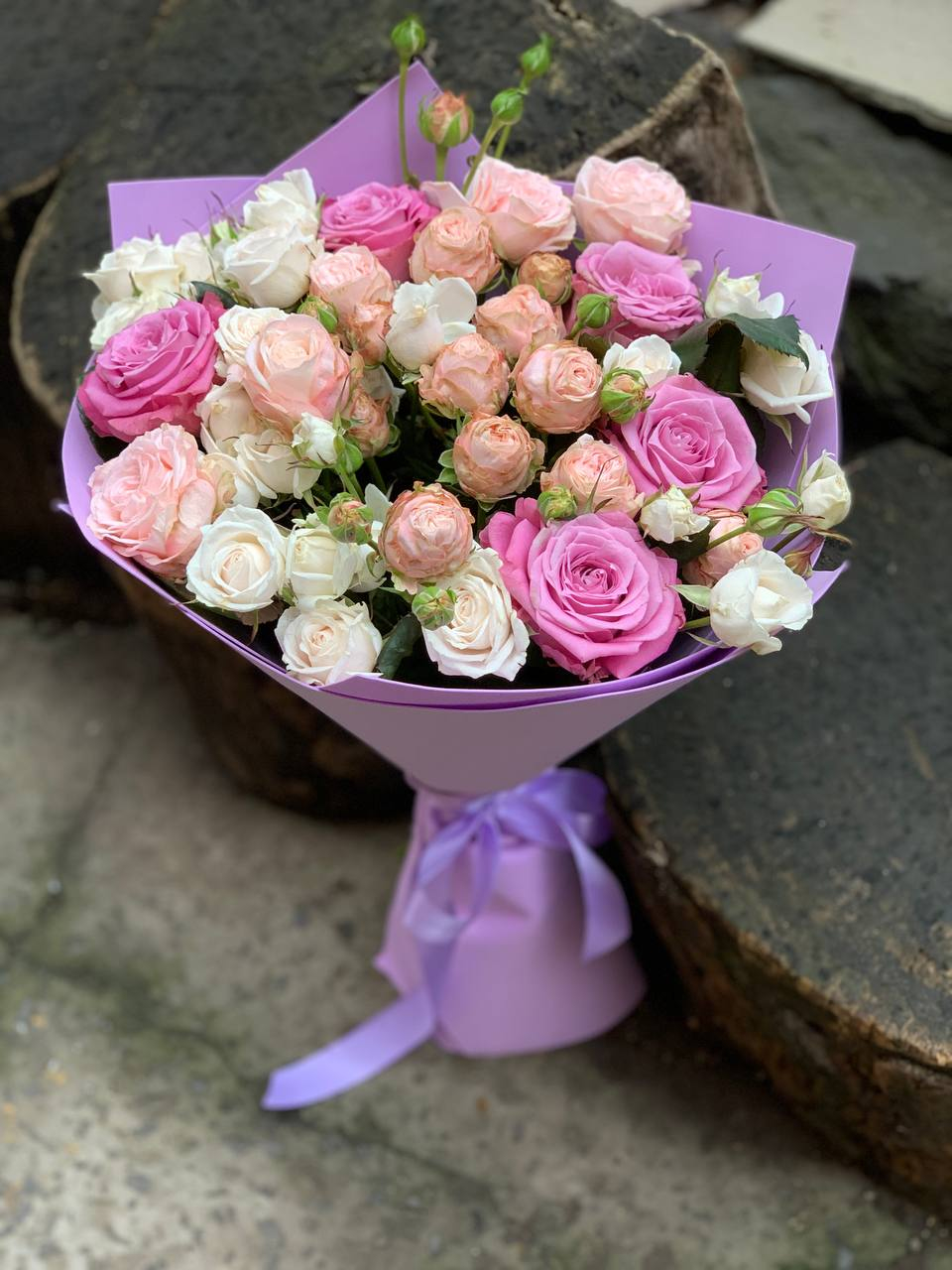 Состав Роза кремовая 50см - 5 шт. Кустовая роза 50см - 7 шт. Кустовая роза пионовидная - 4 шт. Современная упаковка Лента