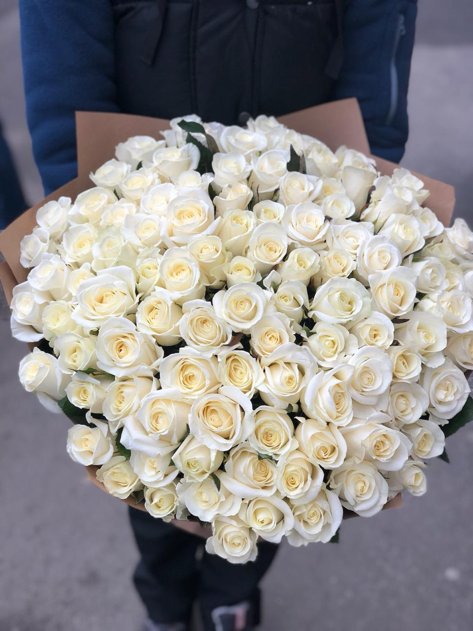 состав: 101 белая роза, современная упаковка бумага крафт, атласная лента