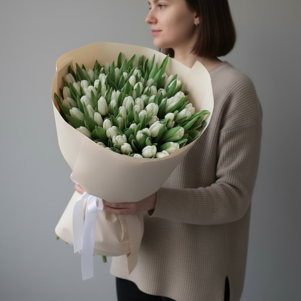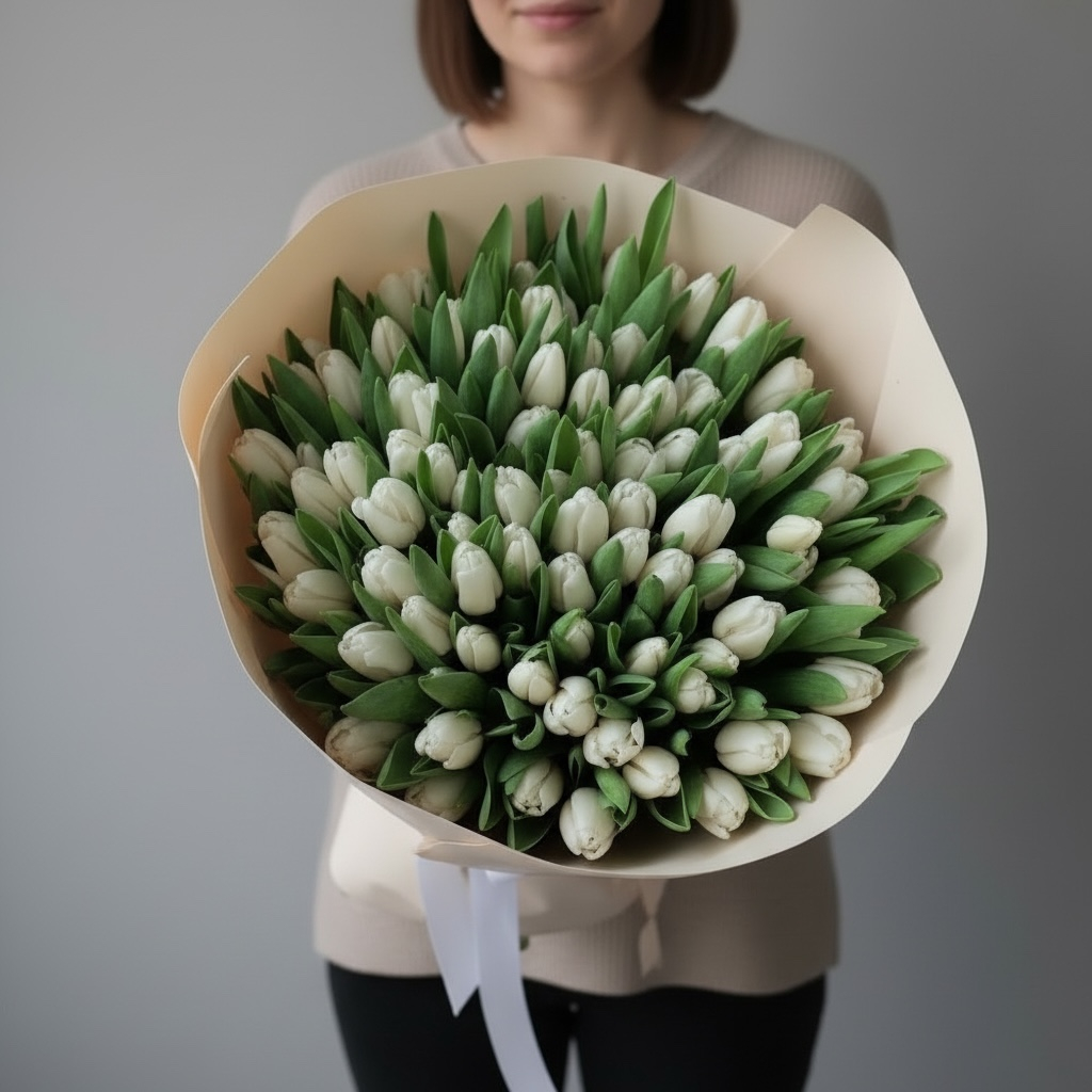 Букет «Белые 101 тюльпан» — это грандиозный жест внимания и искренних чувств в праздничный день. Сотня белоснежных бутонов создаёт эффектное, почти монументальное полотно чистоты и изящества. Каждый цветок проходит строгий отбор: ровные стебли, плотные бутоны, тонкий весенний аромат. Элегантная упаковка подчёркивает торжественность композиции, а бережная доставка гарантирует сохранность свежести до момента вручения. Такой букет станет незабываемым подарком для любимой, мамы или уважаемой коллеги.