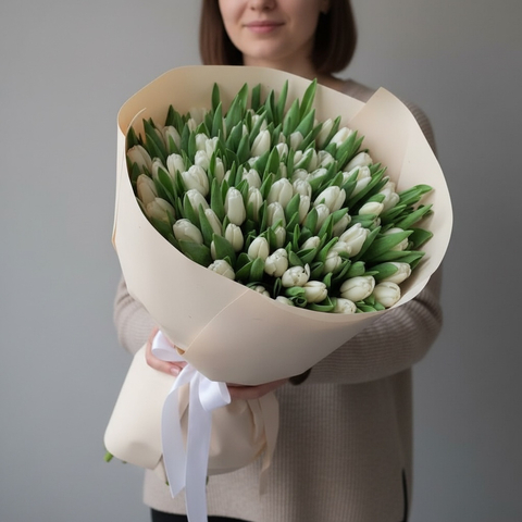 состав: тюльпан белый - 101 шт., современная упаковка кремового цвета, атласная лента
